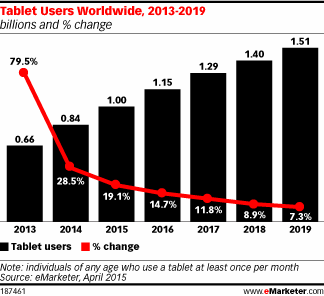 Если в прошлом году аудитория планшетов увеличилась на 28,5%, то в 2015-м рост составит 19%, в 2016-м — 15%, в 2017-м — 12%. Ожидается, что к 2019 году число пользователей достигнет 1,51 млрд. Самая большая аудитория — в Азиатско-Тихоокеанском регионе, где планшетами уже пользуются 370 млн человек. Отметку в полмиллиарда регион преодолеет в 2016 году, говорится в прогнозе eMarketer.