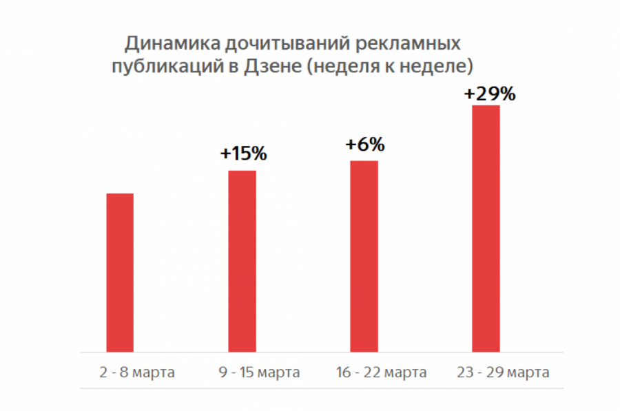 Ключевой показатель интереса к тексту в «Дзене» — количество человек, которые прочитали его до конца. Дочитывание засчитывается, когда пользователь доскролил статью на 100% и сделал это не быстрее, чем за 30 секунд. Суммарное количество дочитываний рекламных материалов в марте увеличивалось неделя к неделе, а пик пришелся на последнюю неделю.