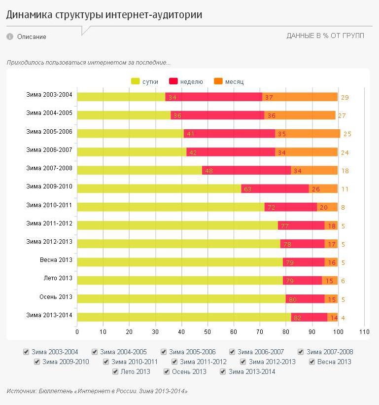 Доля активной аудитории Рунета (той, которая выходит в Сеть хотя бы раз за сутки) сейчас составляет 48% – 56,3 млн человек, следует из отчета ФОМ "Интернет в России: динамика проникновения. Зима 2013 - 2014 гг". Годовой прирост активных интернет-пользователей составил 7%, а для суточной аудитории данный показатель равен 12%.