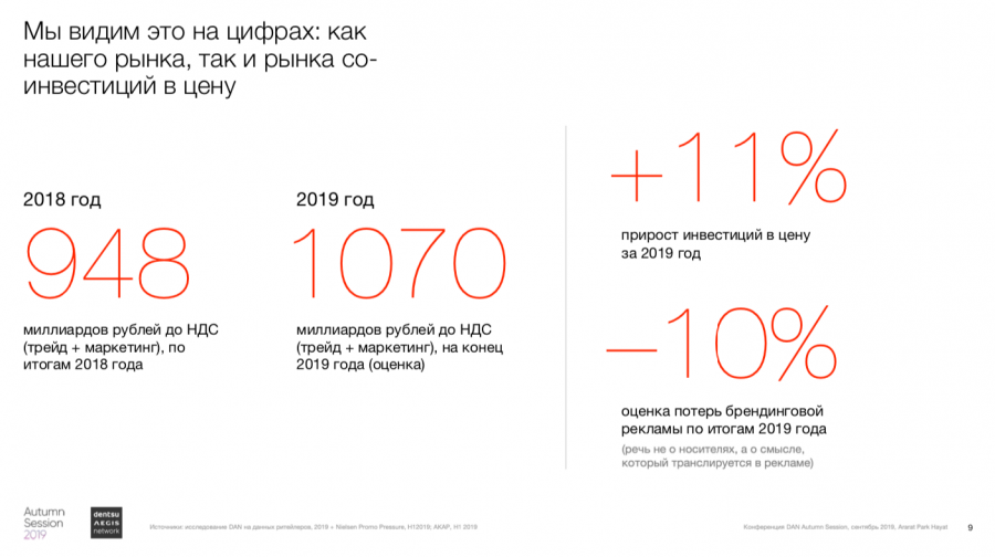 Все это происходит на фоне того, что покупательская способность продолжает падать. Сегодня только 12% потребителей могут позволить себе оставаться лояльными, остальные же предпочитают покупать то, что дешевле. Мы наблюдаем перенос денег из инвестиционных инструментов (брендинговая реклама), в инструменты, которые дают результат «здесь и сейчас» (performance реклама или инструменты полки и цены). То, что со всем этим делать, стало темой обсуждения в следующих секциях. Полную презентацию Марии можно скачать здесь.