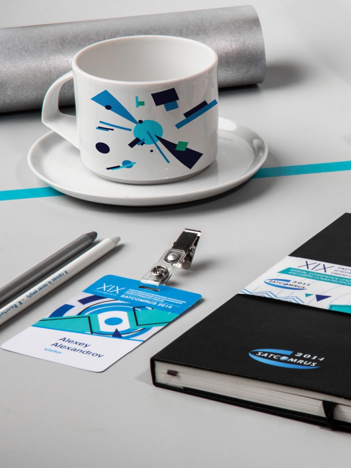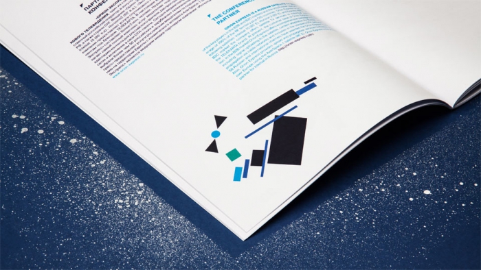 Супрематические композиции стали ёмкими визуальными метафорами для конференции SatComRus. Они украсили пространство сцены и видеостену, видеоролик и баннеры, страницы буклета и сувенирную продукцию события, собравшего специалистов со всего мира из сфер связи, ракетостроения, финансов, властных структур ради глобальной общей цели.