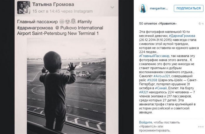 В соцсетях символом трагедии, которая унесла жизни 224 человек, стала десятимесячная Дарина Громова. Перед отлетом в Египет ее мать опубликовала в Instagram фотографию ребенка, сделанную в Пулково, с подписью «Главный пассажир». Через две недели они оказались на борту А321, потерпевшего крушение.