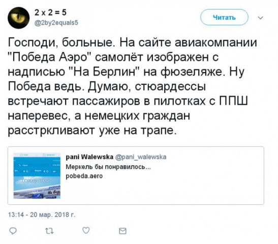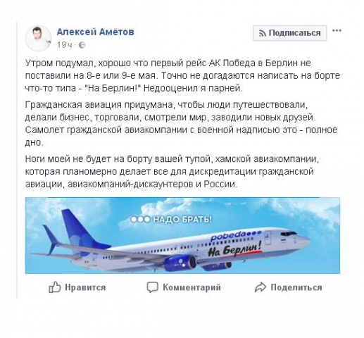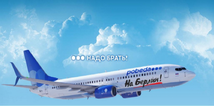 Авиакомпания-лоукостер «Победа», входящая в группу «Аэрофлот», анонсировала старт продаж билетов в Германию. На сайте компании рекламирует новое направление изображение самолета с воинственной надписью «На Берлин». Надпись на фюзеляже повторяет лозунг времён Великой Отечественной войны, который наносился на советские танки. Фото дополняет надпись: «Надо брать!». Кроме того, в авиакомпании обещают установить минимальные тарифы на перелёт до столицы Германии 9 мая.