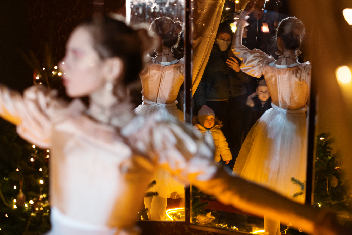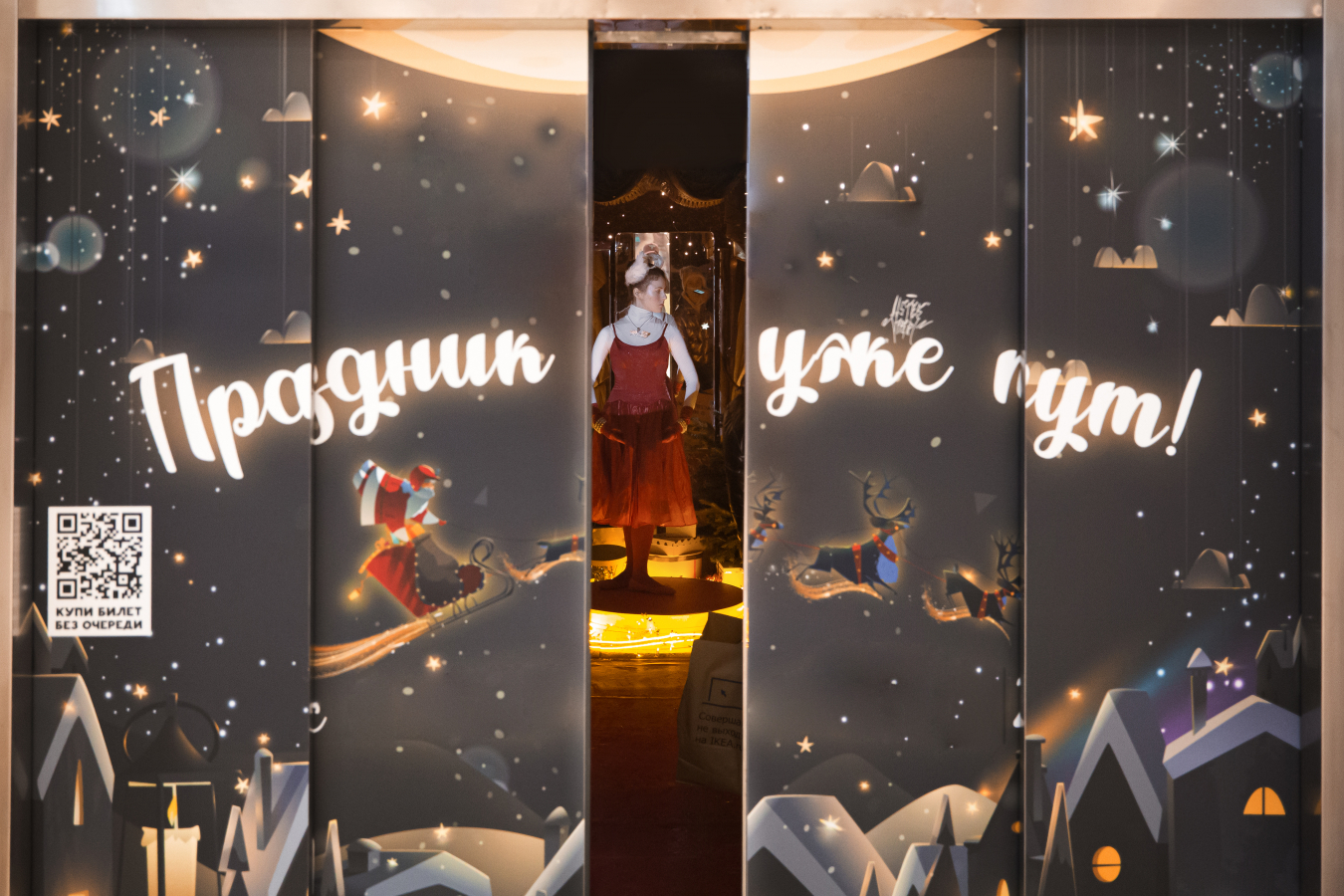 За несколько дней до Нового года двери лифта «Авиапарка» открылись как створки музыкальной шкатулки. Внутри зритель увидел праздничную картину: под музыку Чайковского декорации небольшой сцены озаряются светом, а балерина, похожая на живую статую, в такт кружится на подиуме.