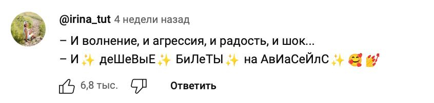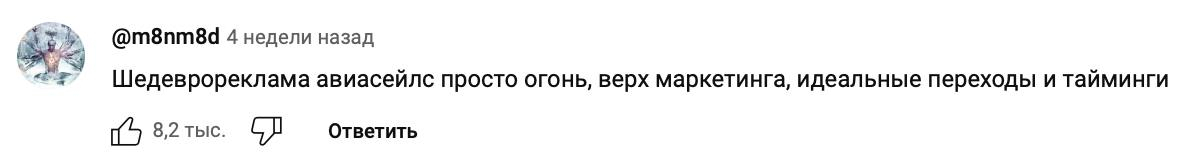 «Авиасейлс» и «Ю» удалось не только создать запоминающуюся рекламу, но и вовлечь зрителей в обсуждение, заставить их делиться своим мнением и эмоциями. Социальные сети буквально засыпаны шутками, мемами и комментариями по поводу кейса.