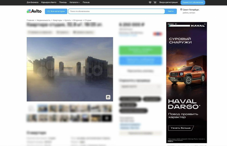 Авито в горизонтальном формате. Теперь на площадке доступны вертикальные баннеры во всю высоту экрана в карточках с квартирами или автомобилями.