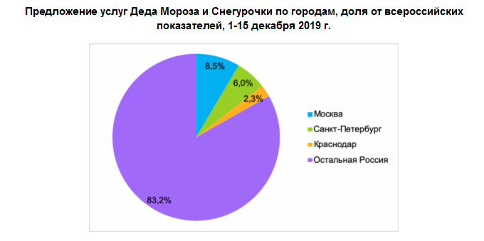 В этом году россияне стали чаще предлагать свои услуги в роли Деда Мороза и Снегурочки — предложение выросло в 13 из 22 рассматриваемых крупнейших городов страны. Активнее всего Деды Морозы и Снегурочки в предновогодний период в Москве — на столицу приходится 8,5% от всех предложений по стране.