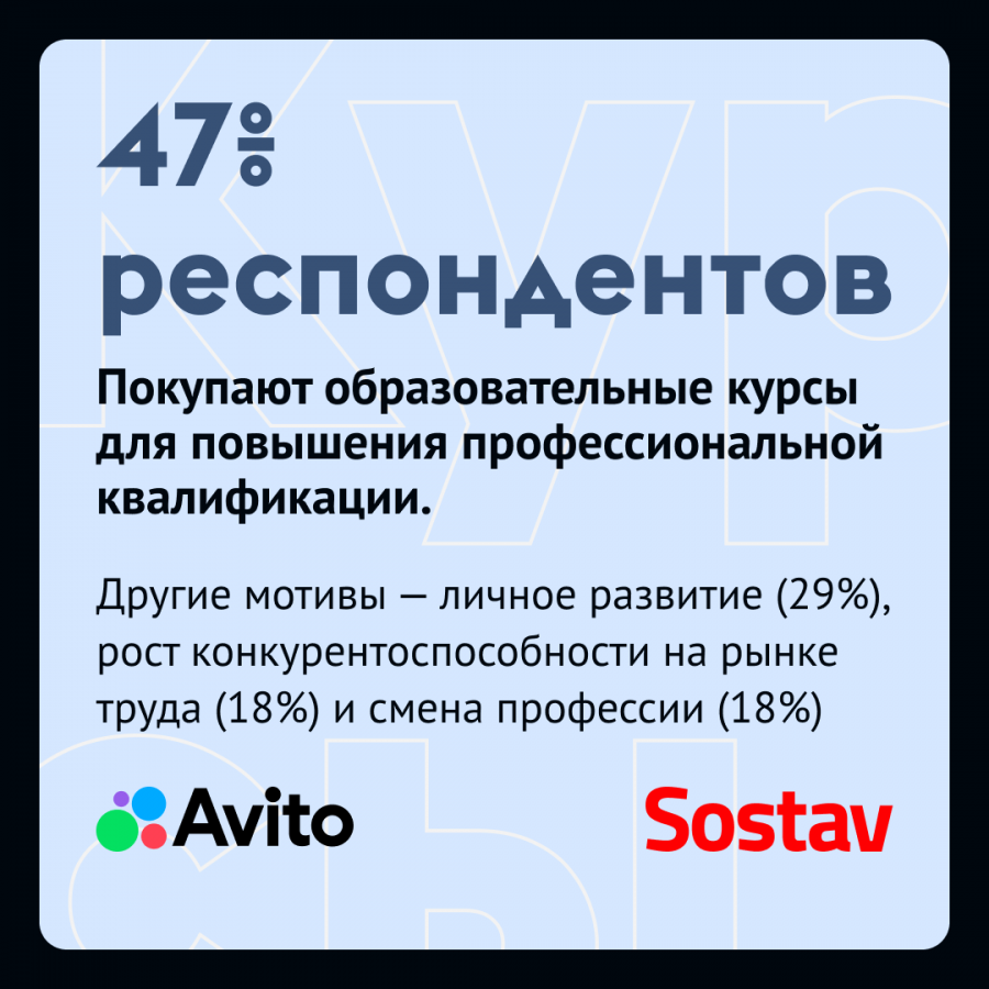 Чаще всего россияне покупают образовательные курсы для повышения профессиональной квалификации (об этом сообщили 47% респондентов). Также пользователи проходят дополнительное обучение для личного развития (29%), роста конкурентоспособности на рынке труда (18%) и смены профессии (18%). Среди других причин — поиск хобби (17%) и развитие социальных связей (10%).