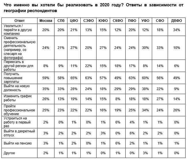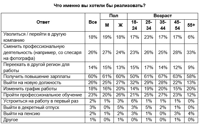 Больше всего на перемены рассчитывают жители Северо-Кавказского федерального округа (83% отметили соответствующий вариант ответа). В Южном федеральном округе больше всего тех, кого в профессиональном плане все устраивает (34%). Возраст большинства тех, кто что-то хотел бы поменять, находится в диапазоне от 25 до 34 лет (82%). Самые консервативные респонденты — старше 55 лет. Более 40% из них не хотят в будущем году ничего менять.