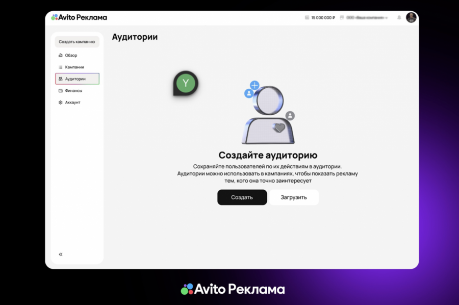 Создание кастомных таргетингов доступно в разделе «Аудитории» рекламного кабинета «Авито Рекламы».