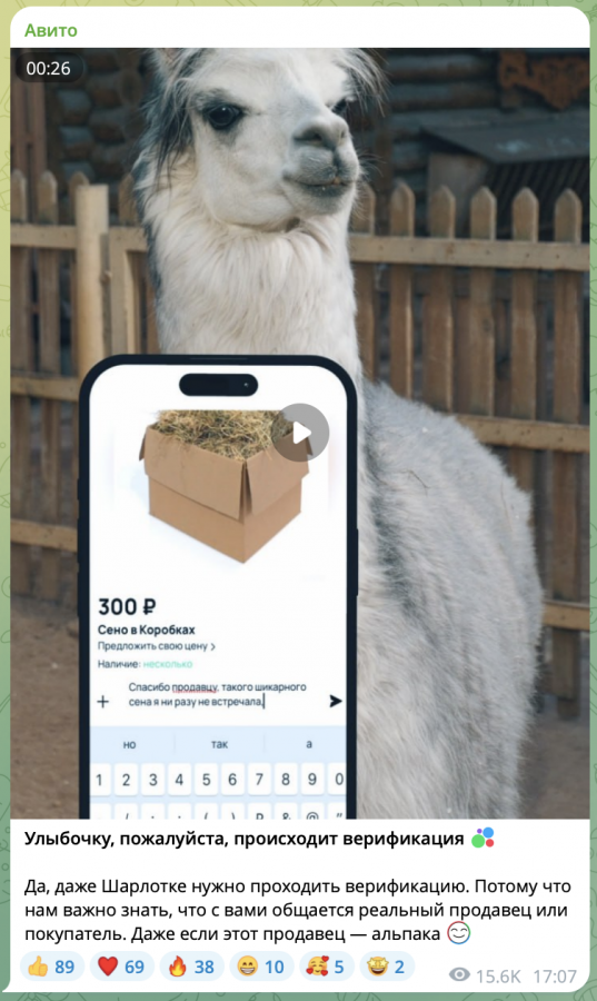 Авито » оригинально подошла к вопросу безопасности пользователей и сделала инфлюенсером… альпаку из Ленинградского зоопарка. Кампания собрала более 22 миллионов охватов и стала примером того, как даже о сложных темах можно говорить просто и весело.