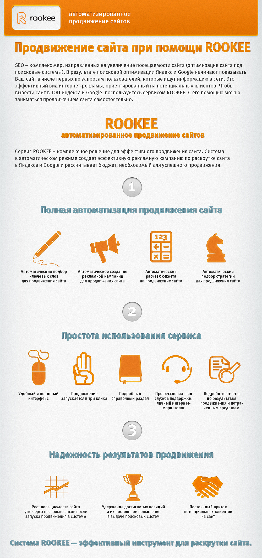 Один из самых низкозатратных и эффективных способов увеличения рентабельности бизнеса – это раскрутка с помощью системы продвижения сайтов ROOKEE.