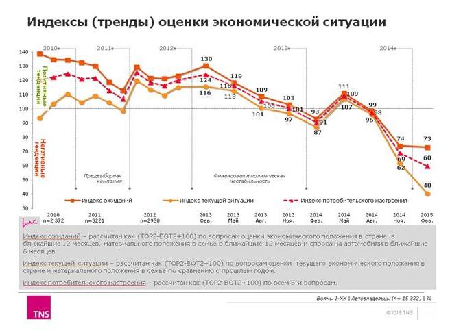 Настроения автовладельцев, по данным TNS, в феврале-марте 2015 года оптимизмом не отличались. Поэтому индекс текущей ситуации достиг беспрецедентно низких значений, минимума за последние несколько лет, упав сразу до 40 пунктов.