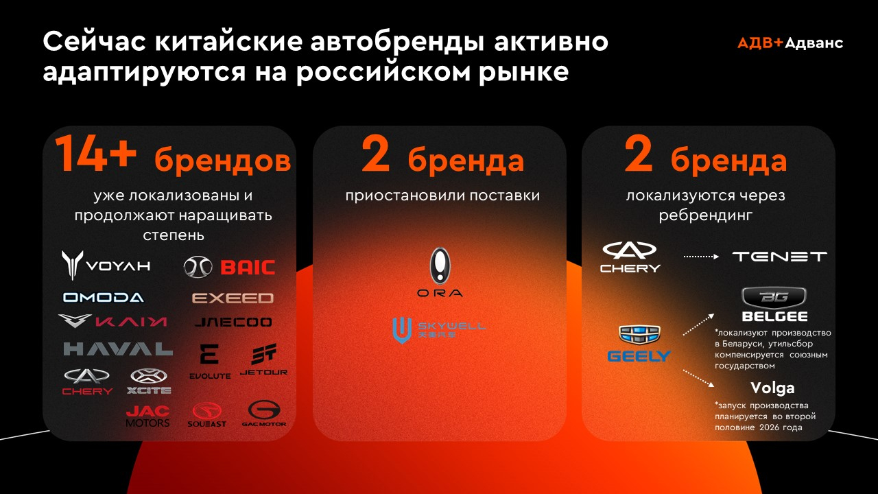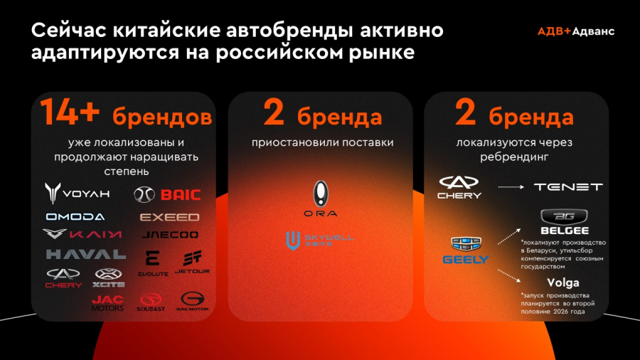 Со стороны предложения продолжается развитие локализации. Более 14 китайских брендов уже реализуют или планируют углубление производственных процессов в России и союзных юрисдикциях. Это становится не просто фактором оптимизации затрат, а условием долгосрочного присутствия.