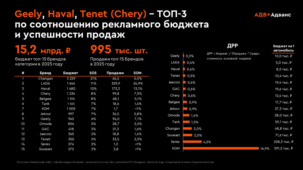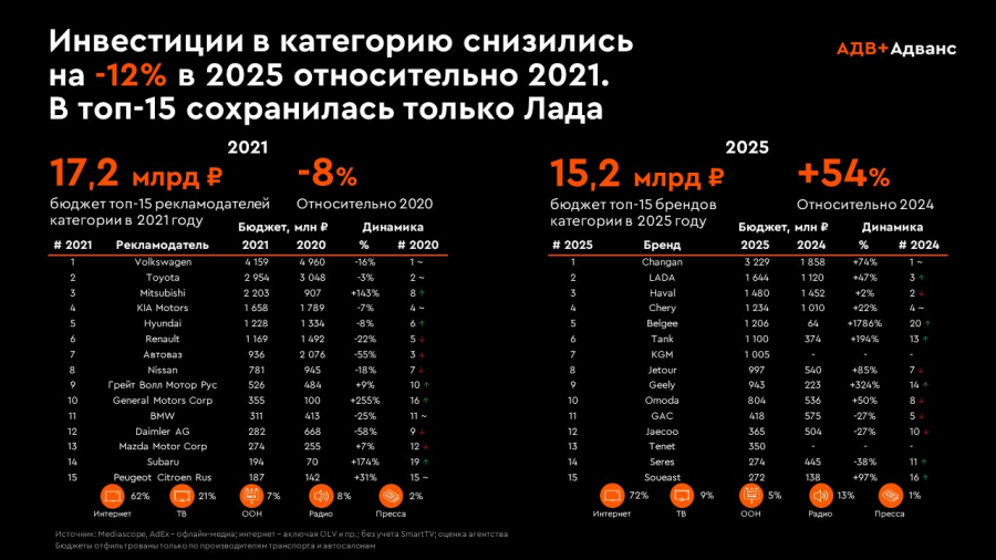 Отдельно стоит отметить изменения в медиастратегиях. Рекламные инвестиции в категории остаются значительными — около 15,2 млрд руб. у топ-15 брендов при объеме продаж 995 тыс. автомобилей (источник: Mediascope, AdEx, оценка «Адванс»). При этом до 70−90% бюджетов сосредоточено в диджитал-каналах.