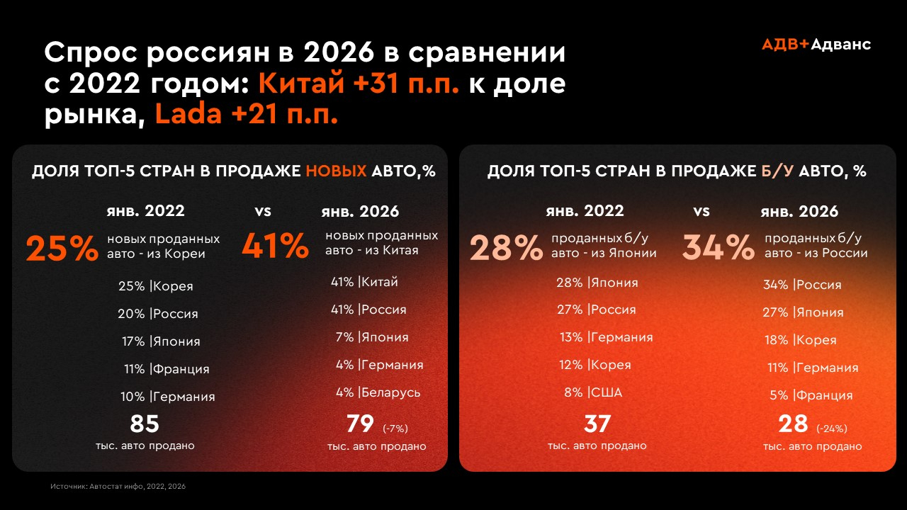 На этом фоне происходит ключевой структурный сдвиг — усиление китайских брендов. Уже сегодня они формируют около половины продаж новых автомобилей, а с учетом Lada — до 80% рынка (источник: «Автостат»). С 2022 по 2026 год доля китайских производителей увеличилась на 31 п.п.
