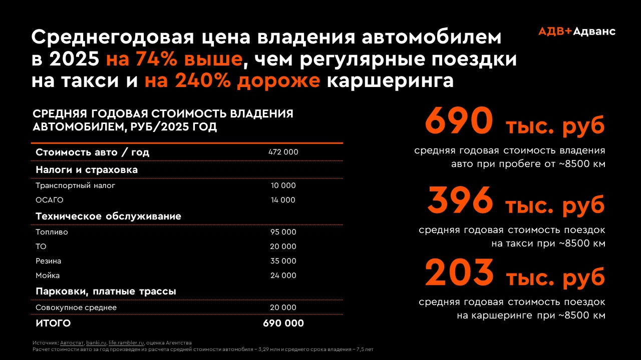 Дополнительно меняется экономика владения. Среднегодовые расходы на автомобиль — около 690 тыс. руб. против 396 тыс. на такси и 203 тыс. на каршеринг (источник: «Автостат», banki.ru, life.rambler.ru, оценка «Адванс»). Это не приводит к отказу от личного транспорта, но усиливает требование к обоснованию покупки. Решение становится более взвешенным, цикл — длиннее.