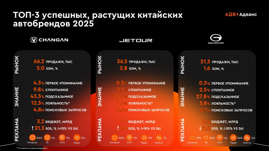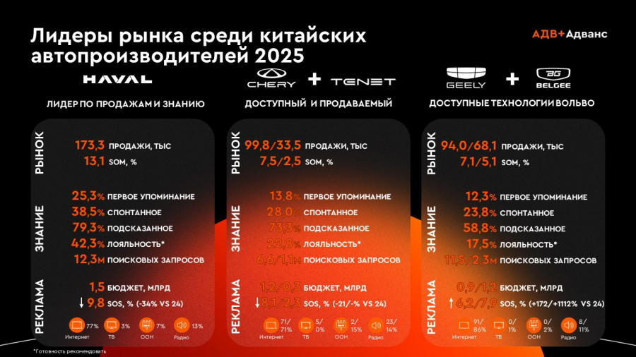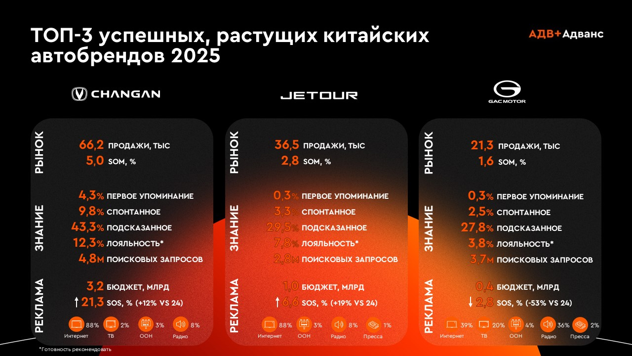 Таким образом, китайские автомобильные бренды закрепили свою роль ключевых игроков на российском рынке. Следующий этап развития категории будет связан не столько с количественным ростом, сколько с углублением конкуренции, развитием позиционирования и повышением эффективности работы с аудиторией.