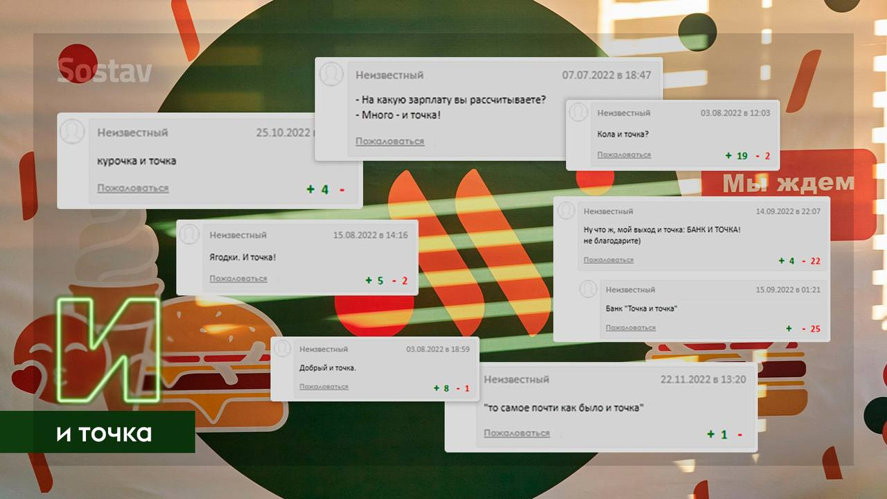 Словосочетание «и точка» стало главным мемом среди российских рекламщиков в 2022 году, а по совместительству и самым популярным комментарием на Sostav. Благодарить за это надо авторов ребрендинга бывшей сети «Макдональдс», которые подарили российскому рынку «Вкусно — и точка». Теперь можно даже сказать, что «и точка» — это новый лозунг локализации брендов в России, ведь ни один ребрендинг второй половины 2022-го не избежал шуток на эту тему.