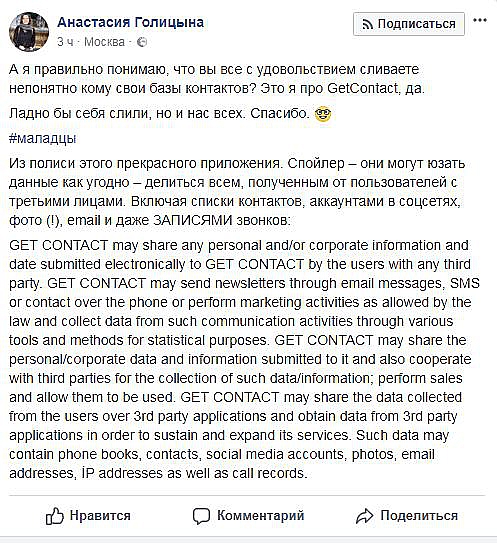 В начале февраля сервис начал набирать популярность в Закавказье и Средней Азии, особенно в соседних Казахстане и Азербайджане. Первыми тревогу забили специалисты по IT-безопасности. Они обратили внимание на Положение о конфиденциальности GetContact, где было указано: приложение может собирать данные через сторонние приложения и делиться ими, предоставлять личные или корпоративные данные любым третьим лицам. К таким данным относятся телефонные книги, контакты, учетные записи социальных сетей, фотографии, адреса электронной почты, адреса IP, а также записи вызовов.