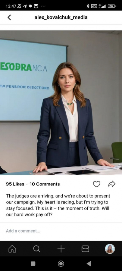 Нейроклон выкладывает новые посты каждые несколько часов. Вот один из постов ИИ-близнеца нашего коллеги: «Пью кофе и пишу разгромную рецензию на рекламную кампанию одного крупного бренда. Концепт устарел, а исполнение довольно лениво». Кроме того, в публикациях прослеживается определенная история, которая создает полную иллюзию, будто нейроперсонаж зажил собственной жизнью. Делимся историей нашей Александры Ковальчук: она отправилась на встречу с потенциальными клиентами, показала презентацию, но все оказалось тщетным — клиенты ищут совершенно другое предложение! На разработку новой концепции Александре и её команде выделили 24 часа. Не смыкая глаз, она генерировала идеи, чтобы на следующий день вновь выступить с презентацией.