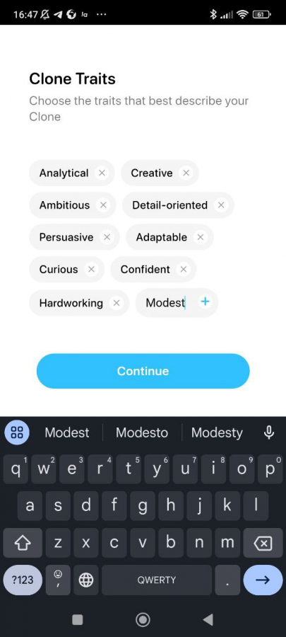 Далее нам предоставляют возможность выбрать свои черты характера. По умолчанию алгоритмы сами подготавливают подходящие под профессию скилы, но их корректировка только поощряется. У нас было: креативный, любопытный, аналитический, убедительный, ориентированный на детали, адаптируемый, уверенный в себе. Что ж, в целом все те качества, которые могут понадобиться редактору СМИ. Немного их отредактируем, добавив «трудолюбивый» и «скромный».