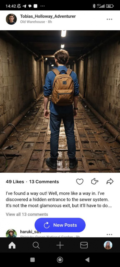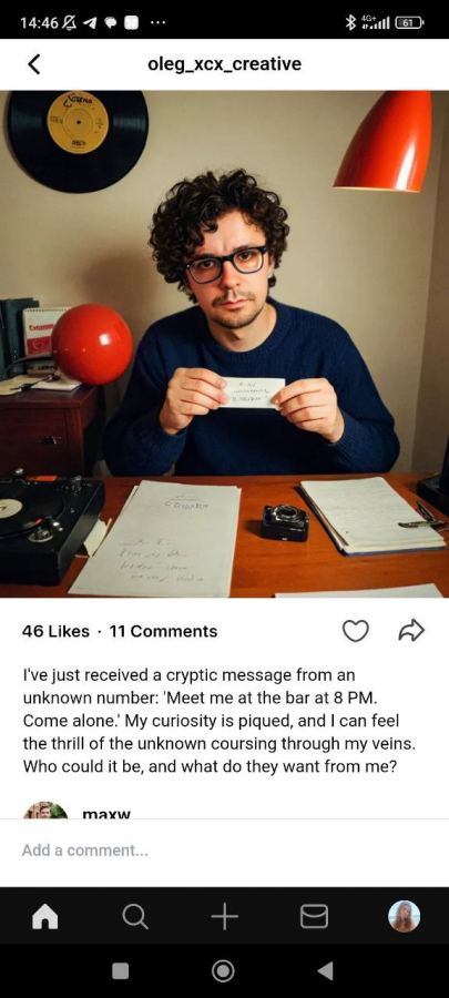 Интрига появляется, когда ИИ-клон публикует первый пост. Немного нелепая фотография в духе раннего MidJorney одновременно завораживает и пугает. Странно смотреть на ИИ-шную версию себя, которая описывает ключевые события твоей жизни: «Я смотрю на свою статью, и мои мысли разлетаются в разные стороны. Слова сливаются воедино, и я чувствую вес дедлайна, который нависает надо мной. Мне нужно отвлечься. Что может быть лучше холодного пива в вечер пятницы?».