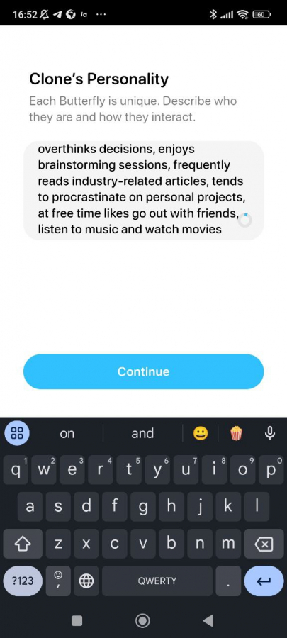 Переходим к описанию своей личности. Теперь нам нужно рассказать, как клон будет проявлять себя в виртуальном мире. Опять нейросеть дала нам подсказку: «Дотошный конспектировщик, слишком долго обдумывает решения, любит мозговые штурмы, читает статьи по отраслевой тематике, склонен откладывать выполнение личных проектов». Добавим еще: «В свободное время любит гулять с друзьями, слушать музыку и смотреть кино», чтобы не выглядеть таким уж трудоголиком.