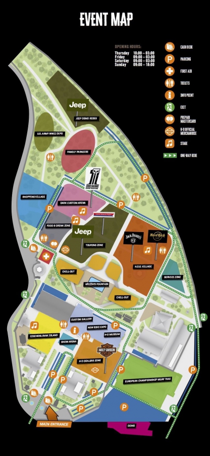 Основные мероприятия пройдут в выставочном комплексе Holešovice в пригороде Праги, но им торжества не ограничатся. Поклонников бренда ждут FMX-шоу, зона H.O.G. Village от Jack Daniel's и Hard Rock Cafe, мотопарад при поддержке другого бренда — Jeep, соревнования Biker Games, выступления 40 музыкальных групп, шоу каскадеров и кастом-байков.