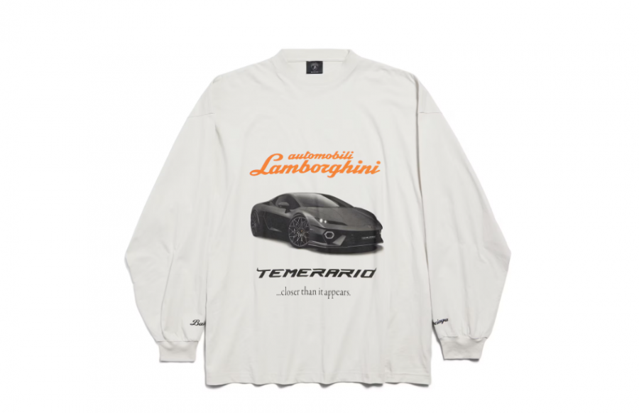 Первая вещь из коллекции, которая уже доступна для предзаказа, — белый лонгслив с изображением нового суперкара Lamborghini Temerario.