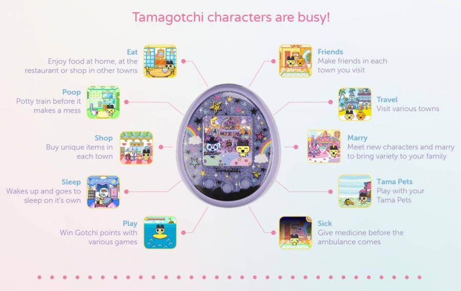 «Тамагочи» представляет собой компактный брелок в виде яйца. На экране появляется зверек, за которым нужно ухаживать — кормить, развлекать, мыть, лечить. Если забыть о питомце, то он умирает. В новой версии питомец сможет находить себе пару и обзаводиться детенышами. На одном устройстве можно будет вырастить до 16 поколений.