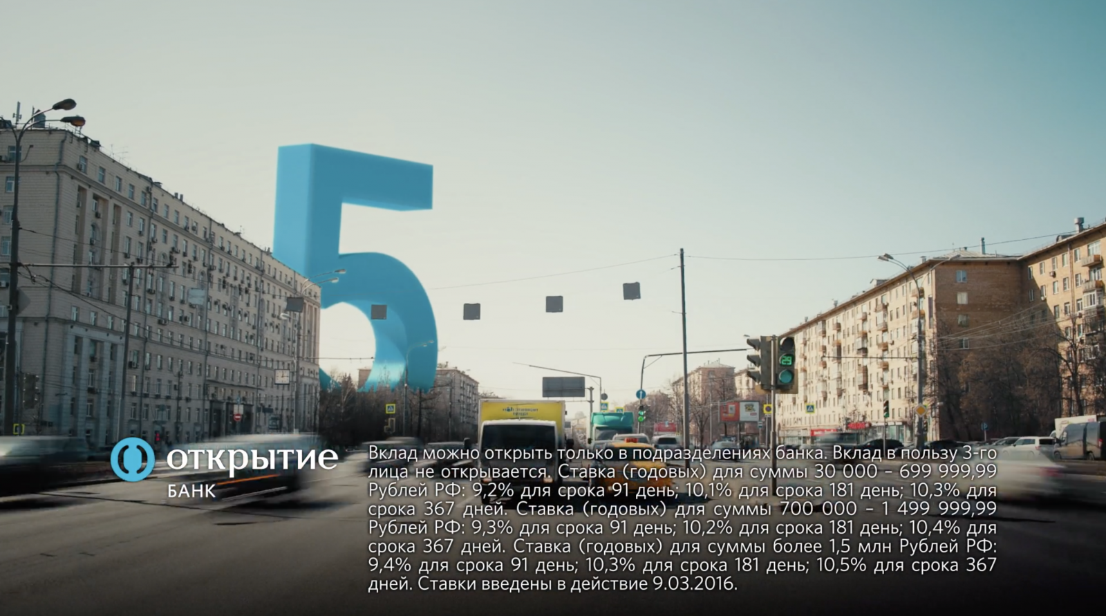 В рекламном ролике зритель видит цифры с изображением нового процента по вкладам от банка, застрявшего среди каменных построек Москвы. Видео захватывает красотой города и позволяет донести до потенциального клиента масштаб предложения.