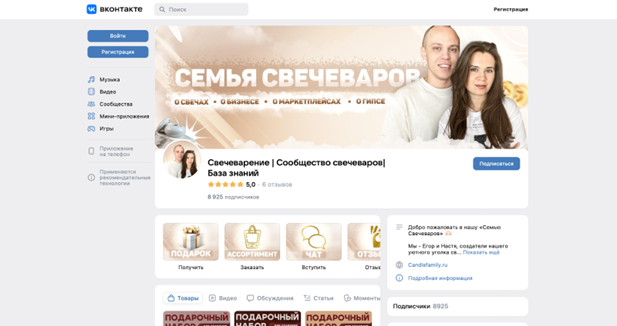 Еще один пример — Егор и Анастасия, которые развивают свой бренд «Семья Свечеваров» на Ozon, «Яндекс Маркете», а также в социальных сетях. В их группе во «ВКонтакте» почти 9 тыс. человек, есть еще и телеграм-чат, где свечевары делятся опытом. Развитие социальных сетей помогает не только формировать сообщество вокруг бренда, но и получать дополнительный доход.