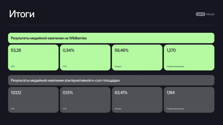 Нашей целью было не просто достижение высоких метрик, а создание убедительного кейса, который доказывает эффективность. Запустив идентичную кампанию параллельно на двух площадках, мы получили чистые данные для сравнения — Wildberries превзошел альтернативу по всем параметрам. Теперь у нашего клиента есть не только трафик, но и алгоритм для распределения будущих бюджетов.