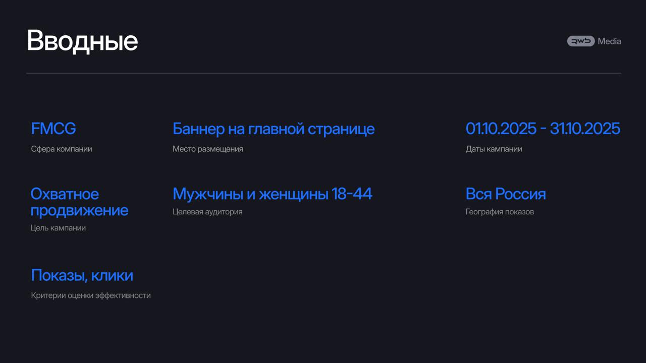 Стояла задача массового охвата аудитории. Бренду было необходимо не только достичь максимального количества показов, но и убедиться, что кампания генерирует реальный интерес — переходы на сайт релевантной целевой аудитории. Дополнительной целью было получить объективные данные для оценки Wildberries как медийной площадки в сравнении с другими e-com платформами, чтобы в будущем обоснованно распределять рекламные бюджеты.