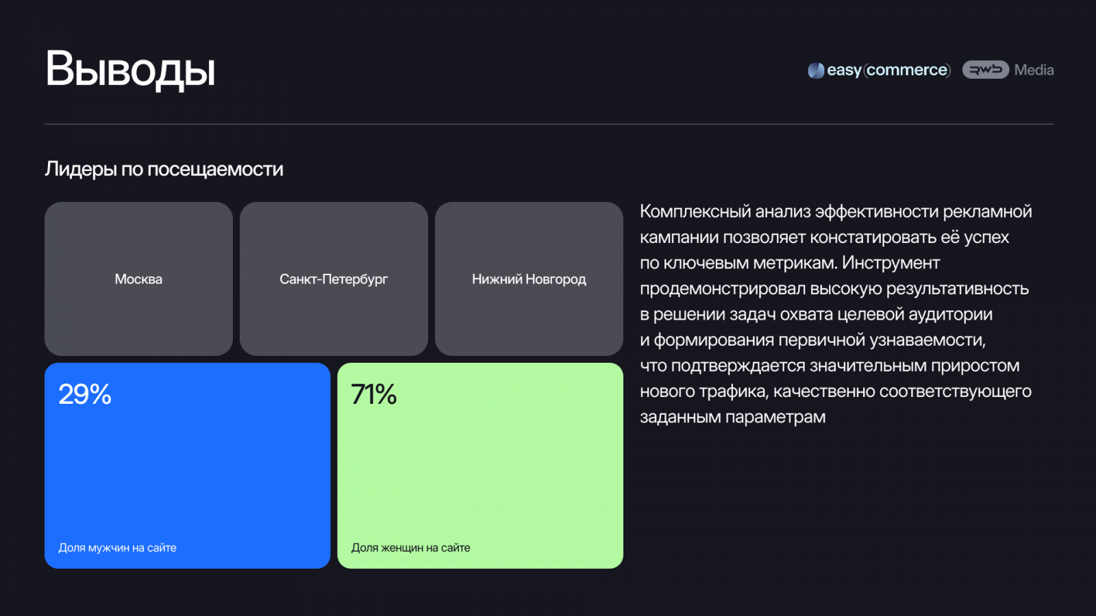 Кроме того, важным бизнес-результатом стал приток качественного трафика с Wildberries на сайт. Благодаря кампании на Wildberries сайт бренда посетили почти 42 тысячи уникальных пользователей. Аудитория идеально соответствовала целевой: 71% посетителей составили женщины в возрасте от 35 до 44 лет и 29% мужчин в той же возрастной категории. Несмотря на охватный характер кампании, вовлеченность аудитории была хорошей: среднее время, проведенное на сайте, составило 32 секунды. Подавляющая часть трафика (90,8%) пришла с мобильных устройств, а география визитов охватила всю страну, однако лидерами стали Москва, Санкт-Петербург и Нижний Новгород.