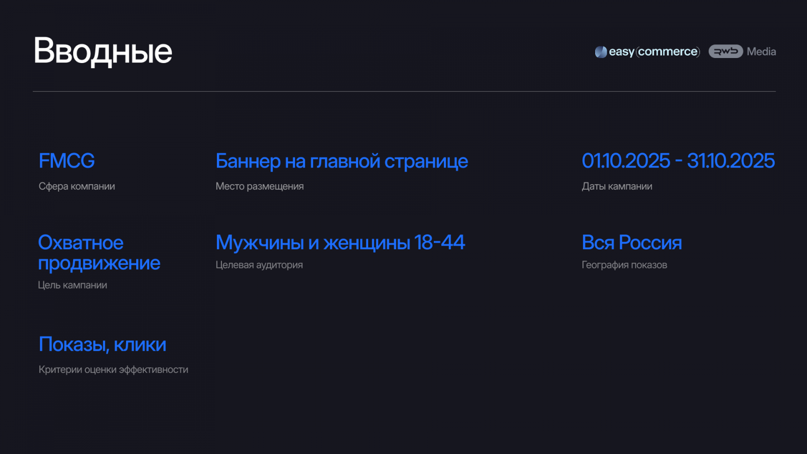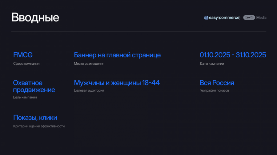 Для достижения максимального охвата эксперты Easy Commerce предложили выбрать формат статичного баннера на одном из самых заметных мест — в слайдере на главной странице Wildberries. Кампания проходила в период с 1 по 31 октября 2025 года. Чтобы получить чистые данные для сравнения, кампания одновременно прошла на альтернативной e-com площадке. Глубокая аналитика позволила детально оценить как медийную эффективность (показы, клики, стоимость), так и посткликовое поведение пользователей на сайте бренда.