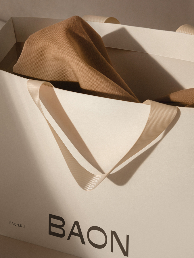 Новая айдентика ритейлера строится на типографике, цветовой палитре и фотостиле. Шрифтовой логотип строится на лаконичности, естественности и красоте. Он разрабатывался с нуля специально для Baon. Получился узнаваемый и отражающий характер бренда знак. Кроме того, были разработаны лого для направлений по стилю и ассортименту, бирки и ярлыки.