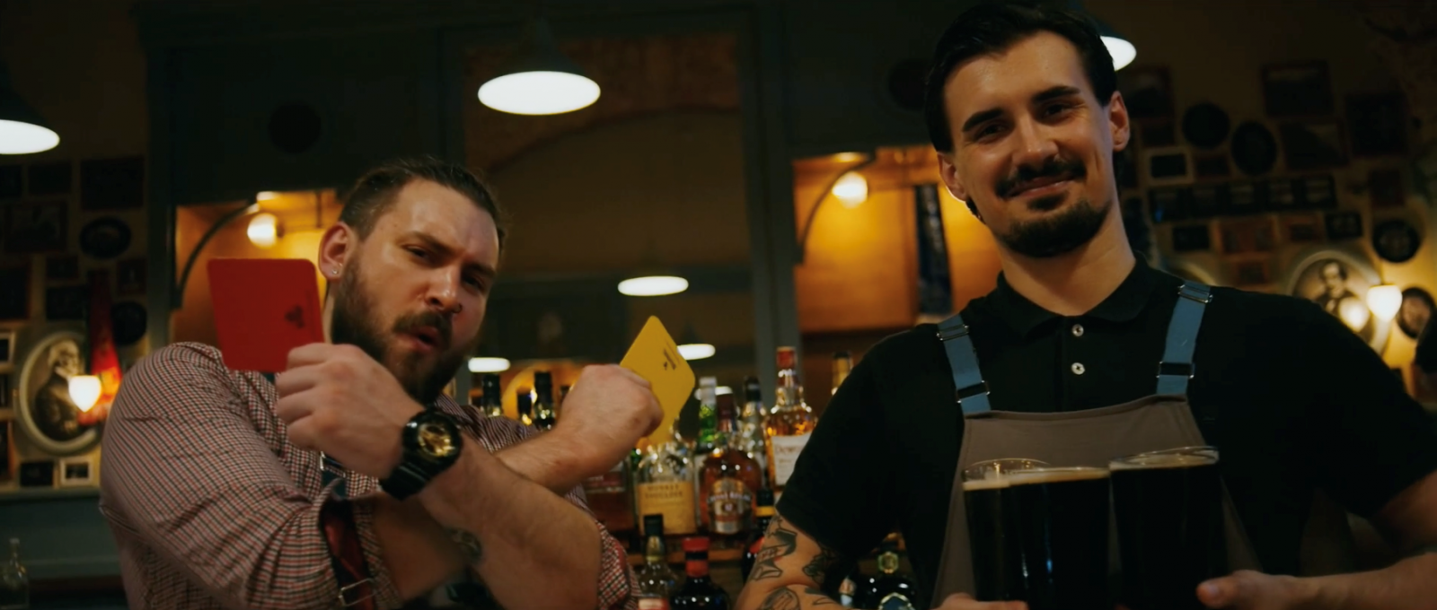 Вместо обычных брендированных пивных подставок были созданы двусторонние желто-красные, наподобие тех, что есть у футбольных арбитров. Поднятая вверх желтая сторона означает «Повторить», а красная — «Последний заказ и счет».