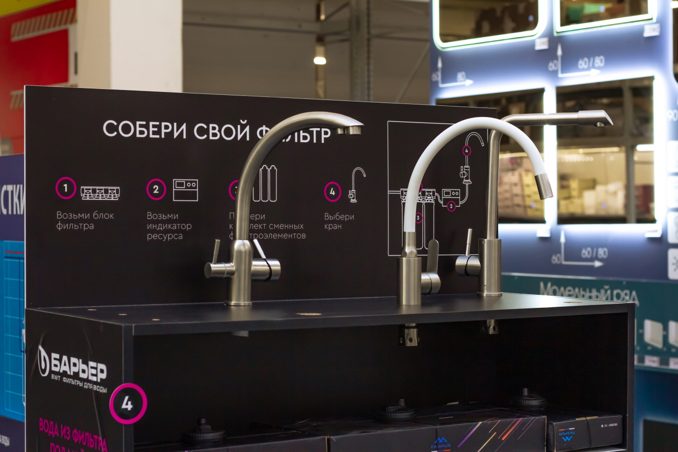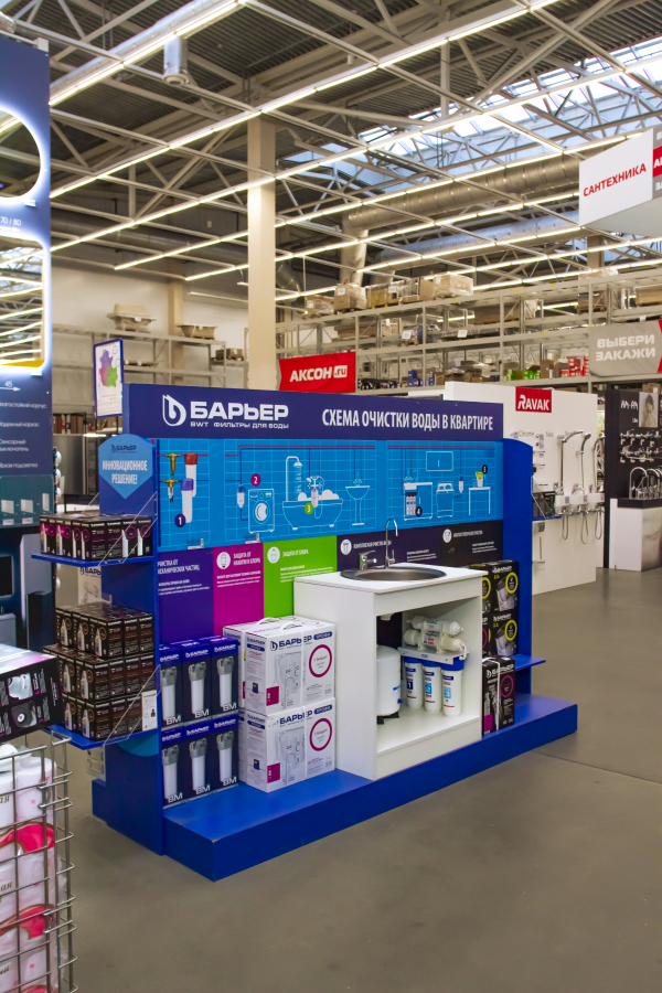 В торговых сетях были установлены бренд-островки с полноценной поэтапной схемой очистки воды в квартире, а также стойки Mix & Match «Собери свой фильтр!». Это позволяет потребителю выбрать составляющие системы фильтрации воды под личный запрос.