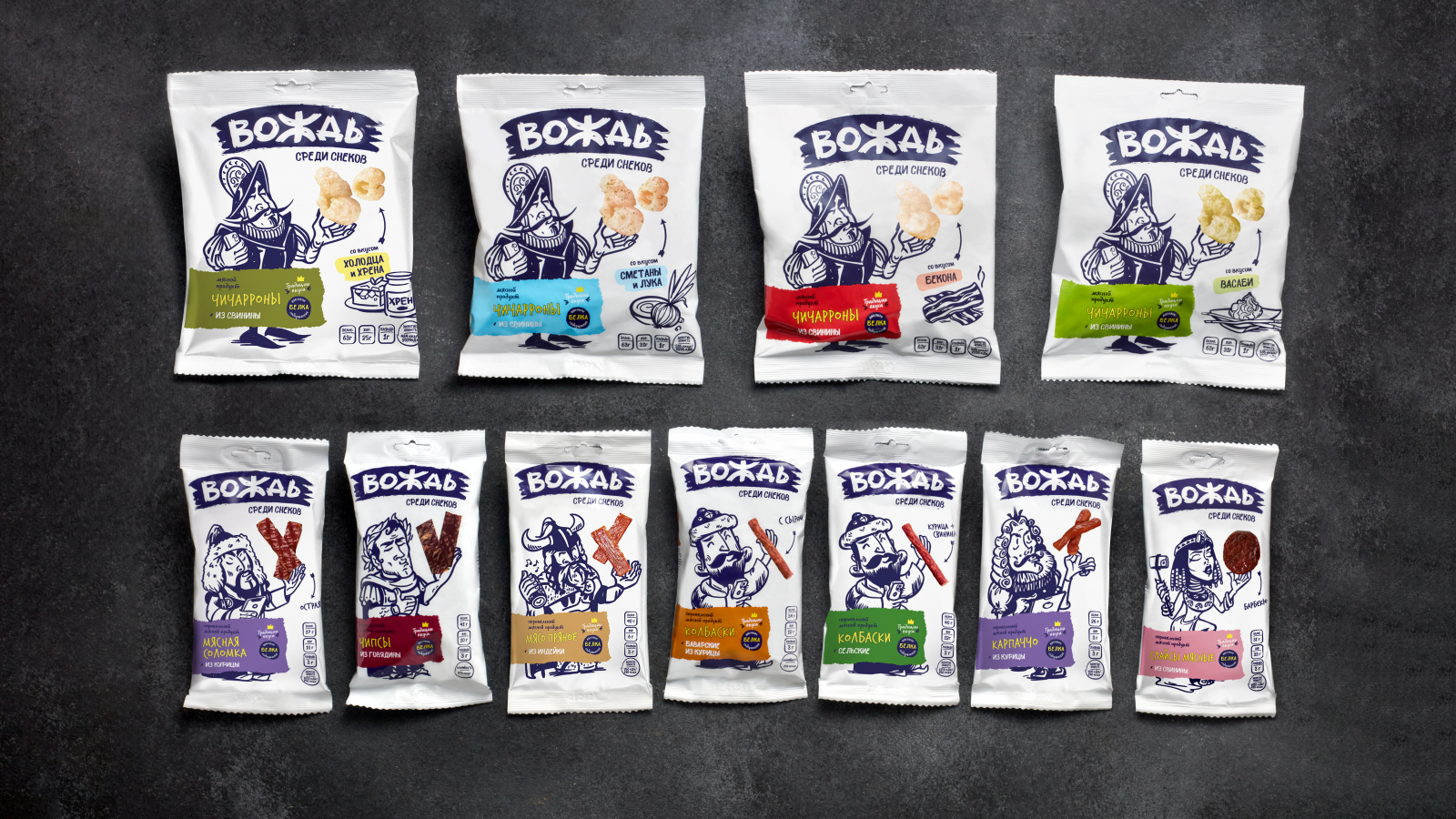 Упаковка использует яркие, необычные цвета и добавляет историческим персонажам современные гаджеты, создавая контраст и улыбку у потребителей. Уникальные изображения, такие как «дворянские слайсы» и «княжеские чипсы», делают продукт запоминающимся. Новинка включает «чиччарон» — протеиновый снек из свинины с пряным вкусом, о котором можно узнать из фуд-зоны с реалистичными фотографиями. Подробнее на Sostav.
