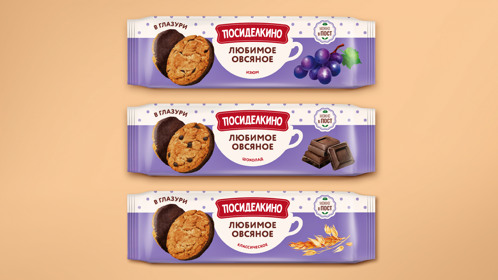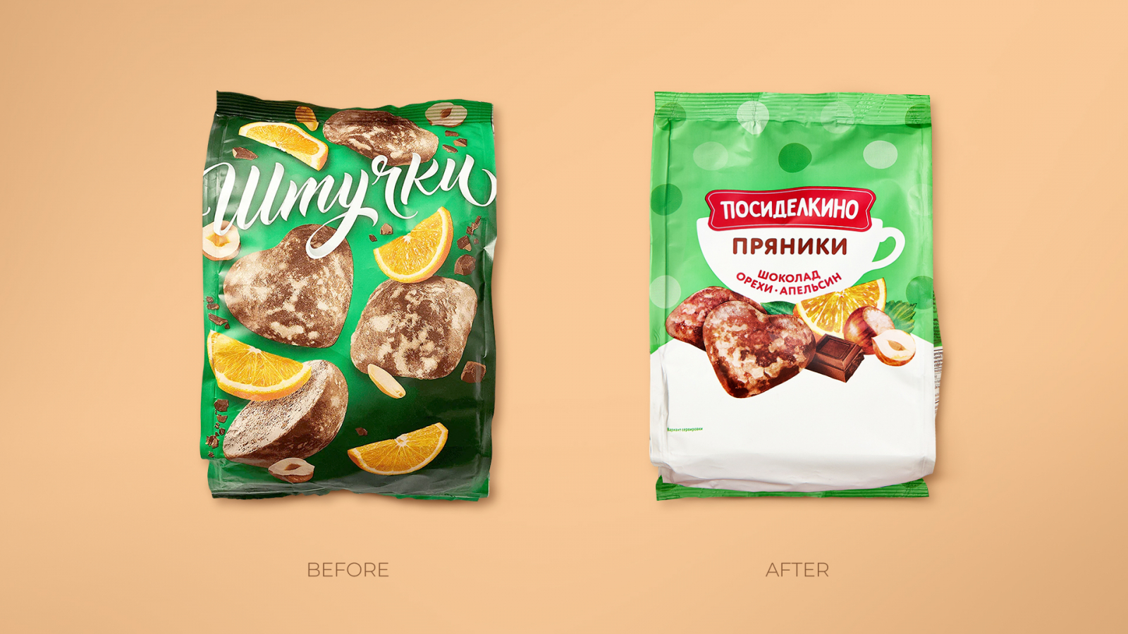 Рестайлинг охватил весь ассортимент: пряники, глазированное и сдобное печенье. Ассортимент дополнен метками, подчеркивающими особенности продукта: «Можно в пост», «Без сахара», «Новинка». Итог работы — современный и запоминающийся образ, привлекающий как традиционную аудиторию, так и новых покупателей.
