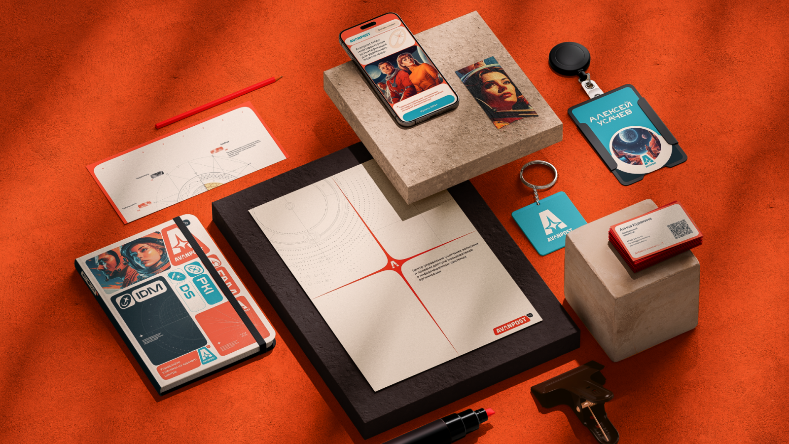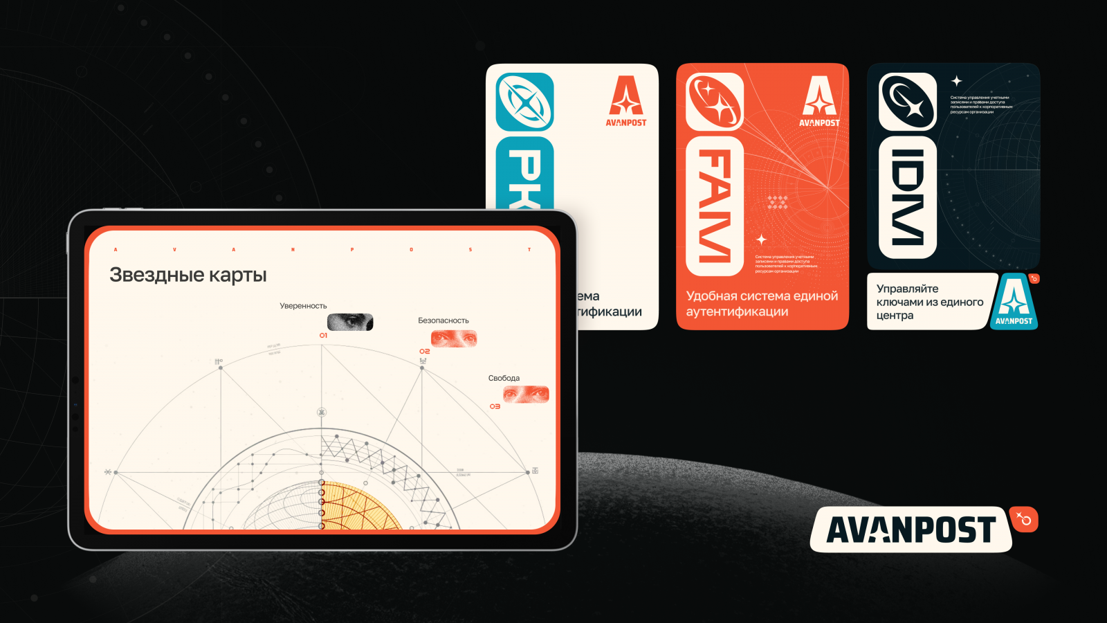 Ключевой элемент нового фирменного стиля — звезда, символизирующая инновации и партнерство. Она присутствует в логотипе и айдентике, отражая слоган компании: «AVANPOST — ваша путеводная звезда в мире информационной безопасности». Геометрические паттерны и нейроарты стали основой визуальной коммуникации, придавая бренду научный и современный облик.