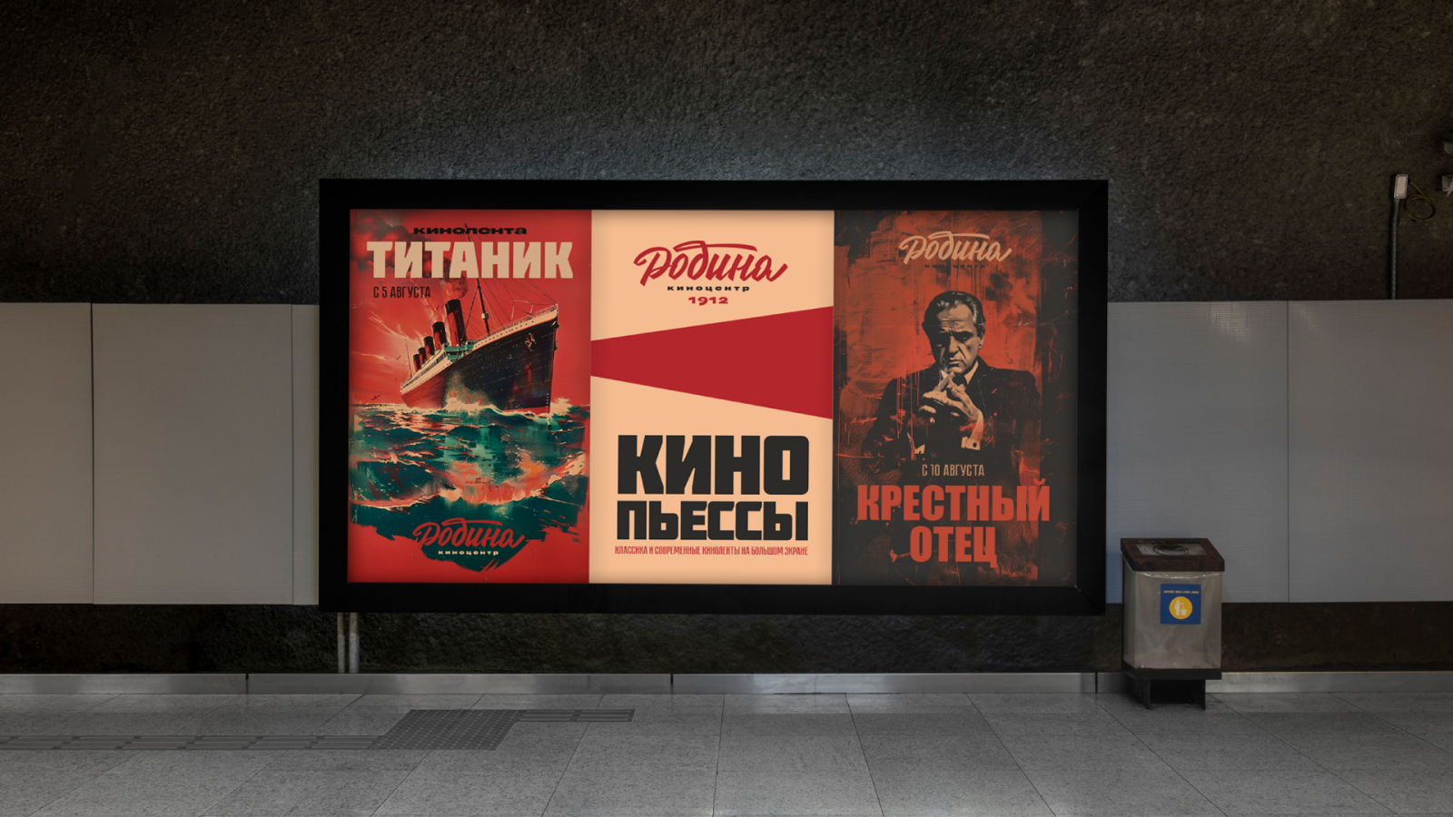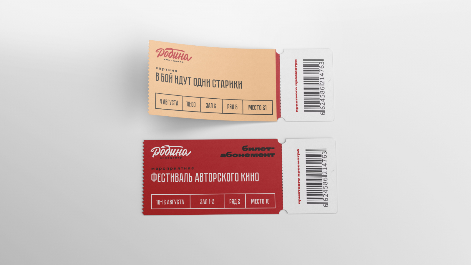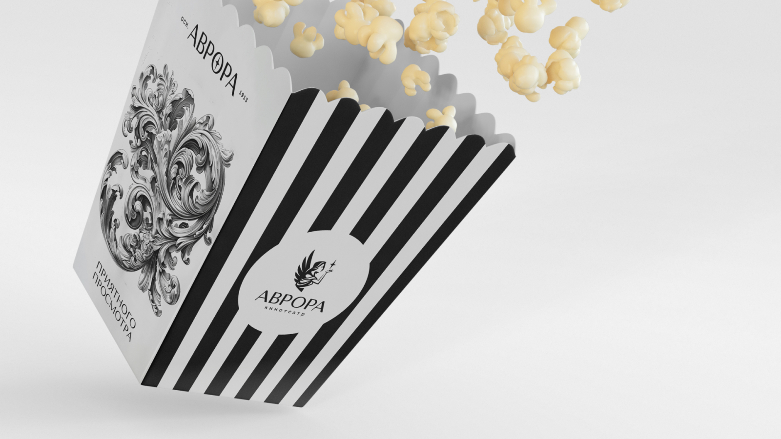 Для «Авроры» создан символ богини, которая несет луч «кино-света», подчеркивающий богатое культурное наследие. Логотип «Родины» выполнен в стиле советского леттеринга, добавив прожектор в качестве ключевого элемента. А «Великан Парк» получил дружелюбного маскота — великана с попкорном, привлекающего внимание семейной аудитории.
