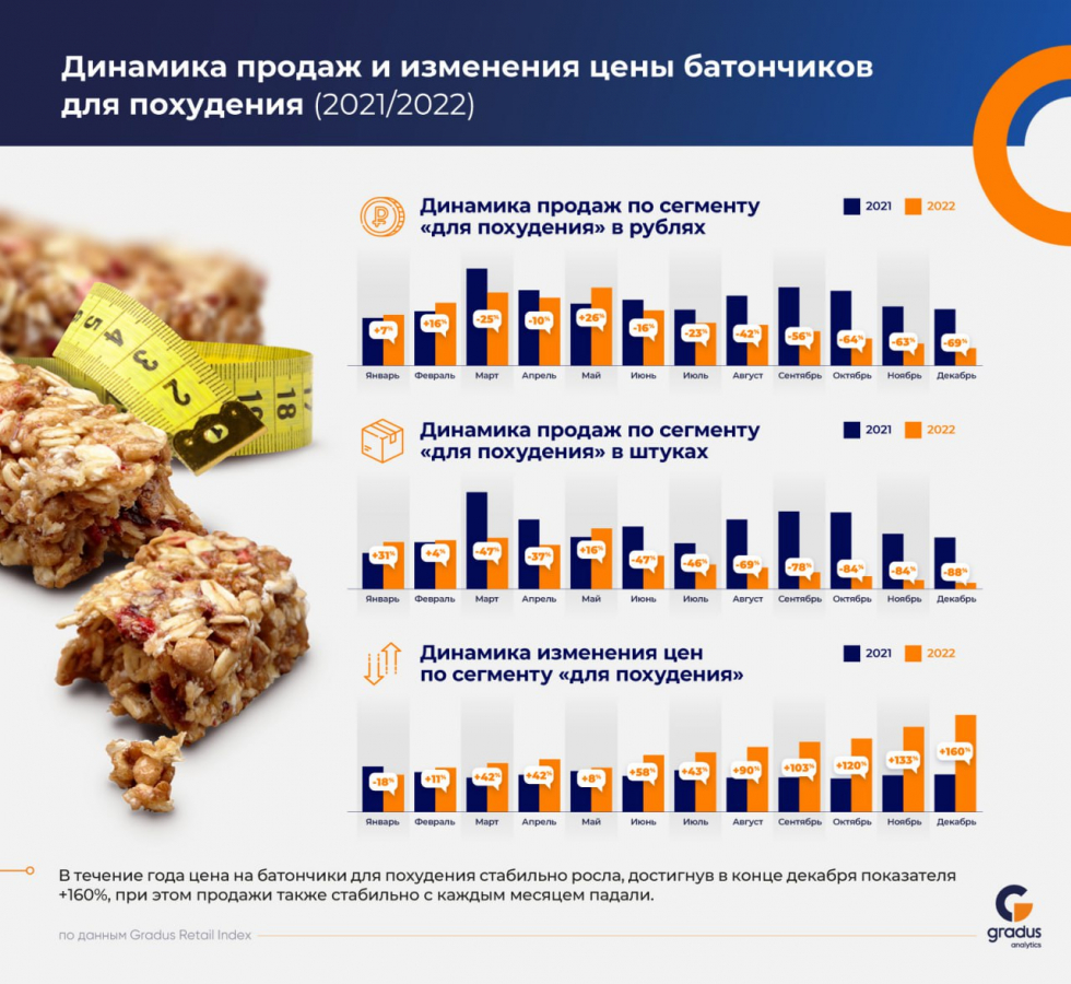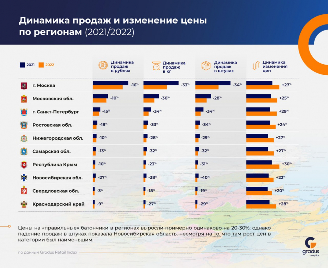 Больше всего снизились продажи батончиков для похудения. Спад произошёл во всех регионах России, потому как цена на них выросла от 17% до 36%. В рублёвом выражении продажи упали на 28%.