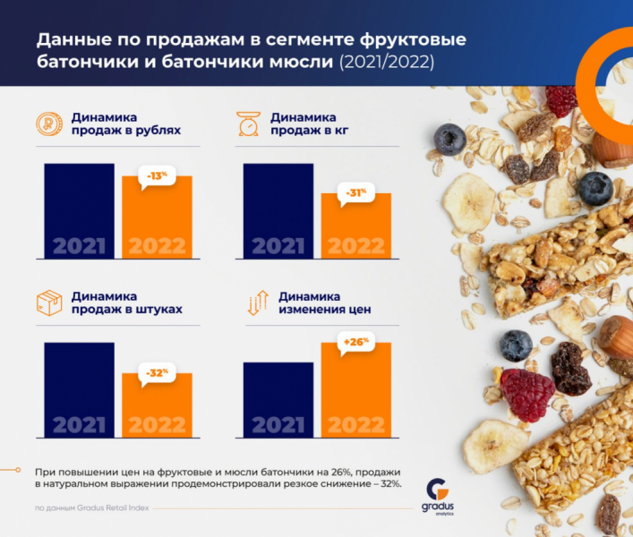 Потребители реже стали покупать и батончики мюсли (на 14%), несколько меньше снизились продажи фруктовых батончиков (на 9%) и ещё меньше — продажи энергетических батончиков (всего на 4%).