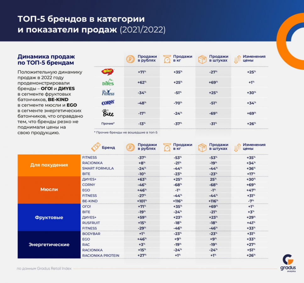Рост средней цены на батончики для похудения на максимальную величину в 42% привёл к максимальному падению продаж в этом сегменте, а цены на остальные виды фитнес-батончиков выросли на 16−31%, поэтому динамика падения продаж в трёх других сегментах рынка была менее выражена.