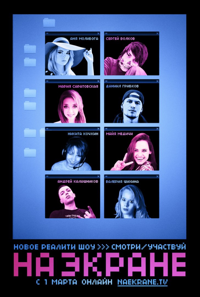 Шоу "На экране" будет идти восемь недель, у него восемь участников, задача которых – полностью заменить реальную жизнь на виртуальную. Каждый из участников живет в закрытой комнате, в начале проекта у него лишь минимальный набор одежды, еды и воды, но нет денег.