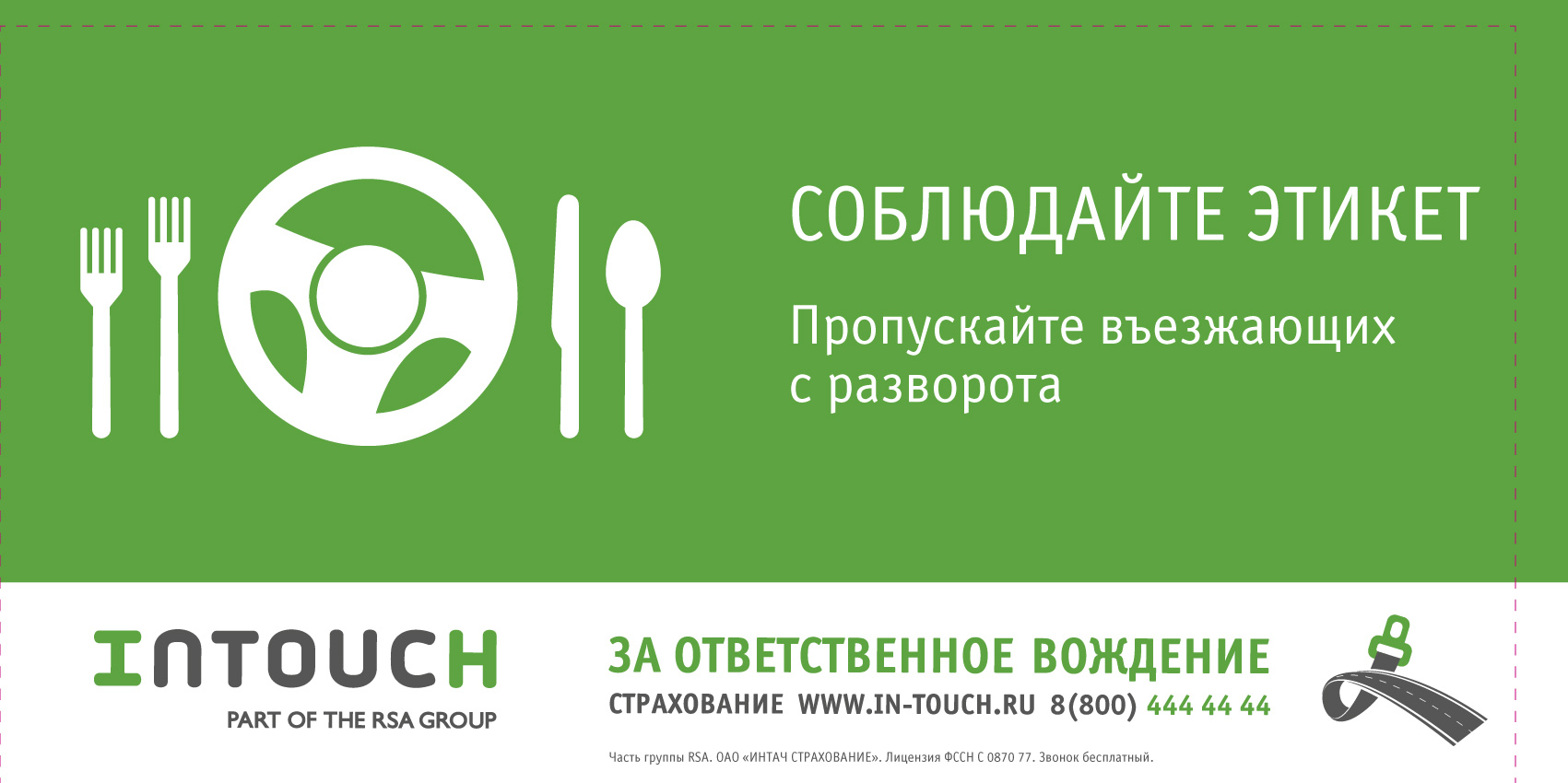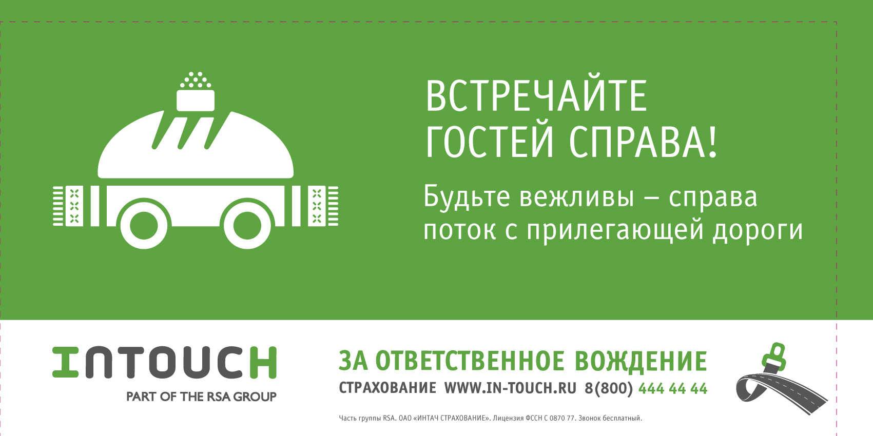 Креаторы агентства BBDO Group разработали outdoor-кампанию для автостраховщика INTOUCH, в которой попыталась научить водителей вежливому и этичному поведению на дорогах. «Ответственные» биллборды уже появились на улицах и магистралях Москвы в местах со сложной дорожной ситуацией.