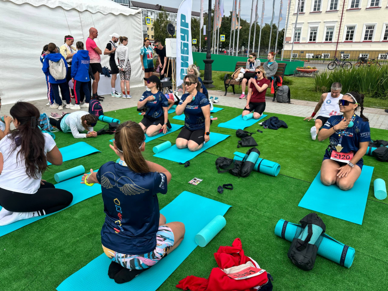 Сразу после грандиозного финиша нужно грамотно восстановиться. Для этого мы застроили зону восстановления для участников — бар с протеиновыми коктейлями и площадку с йога-ковриками и МФР-роликами.